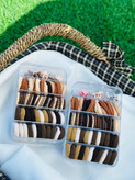 مینی کلیپس ها در سه طرح گل -تاج -ستاره هستند و رنگبندی کش طنابی در هر پک تفاوت است مثلا در بعضی از پک ها رنگ کرم یا آجری در کش های طنابی